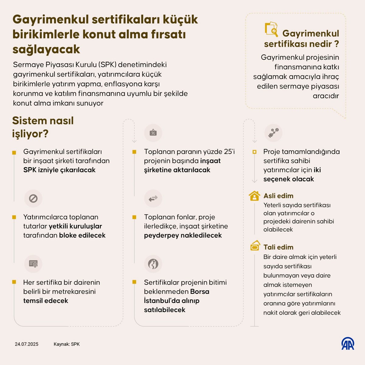 Çevre, Şehircilik ve İklim Değişikliği Bakanlığı, vatandaşların konut sahibi olmasını kolaylaştırmak için TOKİ ve Emlak Konut GYO iş birliğiyle gayrimenkul sertifikası modelini İstanbul Başakşehir’de Damla Kent Evleri Projesi ile hayata geçiriyor.Çevre, Şehircilik ve İklim Değişikliği Bakanlığı, vatandaşların konut sahibi olmasını kolaylaştırmak için yeni bir projeyi daha hayata geçiriyor. Gayrimenkul sertifikası modeliyle vatandaşların kredi ve faiz yüküyle borçlanmadan doğrudan projeye ortak olması sağlanacak. Emlak Konut GYO’nun proje geliştiriciliği ile TOKİ’nin proje tamamlama garantörlüğünün buluşacağı model Başakşehir’de Damla Kent Evleri Projesi ile hayata geçecek. 48 ayda tamamlanacak proje kapsamında 5 bin 325 konut inşa edilecek. Projenin ilk etabında 1540 adet konut halka arz edilecek. 4-8 Ağustos 2025 tarihleri arasında talep toplanacak.Bu konutlardan satın almak isteyen vatandaşlar Sermaye Piyasası Kurulu (SPK) denetiminde bir sermaye piyasası aracı olan gayrimenkul sertifikasını satın alıp biriktirecek. 1 sertifika fiyatı SPK tarafından 7,59 TL olarak belirlendi. Herhangi bir alt veya üst limit koşulu olmadan vatandaşlar bütçelerine göre alım yapıp sertifika biriktirebilecek. Bu sistemle yüksek peşinatlar ve banka kredileri olmadan, "Damlaya damlaya ev olur" düşüncesiyle mülk edinme veya Borsa İstanbul’da işlem gören bir menkul kıymet yatırımı yapma imkanı sunulmuş olacak.EV ALMAK İÇİN NE KADAR SERTİFİKA ALMAK LAZIM?62 m²’lik 1+1 daireler 631 bin 516 adet, 88 m²’lik 2+1 daireler 863 bin 276 adet sertifikaya karşılık geliyor.Yine vatandaşlara mülkün tamamı yerine belirli bir payına sahip olma avantajı sunulacak. Bu sayede her bütçeye uygun ve küçük paylarla konut alımının önü açılacak. Borçlanmadan projeye ortak olma avantajı sunulacak. Damla Kent Evleri Projesi kapsamında, isteyene konut satın alma (Asli Edim), isteyene konut değerini sertifika karşılığı nakit alma (Tali Edim) ya da sertifikalarını dilediği zaman Borsa’da alıp-satma imkanı sağlayan 3 ayrı yatırım seçeneği yer alacak.Proje kapsamında ev sahibi olmak isteyenler ‘Asli Edim’ hakkından faydalanarak konut satın alabilecek. Vatandaşlar Asli Edim’den faydalanmak için gerekli miktarda sertifikayı kendi bütçesine uygun şekilde biriktirip proje tamamlandığında istediği evi satın alabilecek. Proje kapsamında bir konutu ortak satın alma imkanı da sunulacak. İki ya da daha fazla kişi sertifikalarını birleştirerek belirlenen sertifika adedine ulaşınca aynı konuta ortak alabilecek. Paylı mülkiyet denilen bu yöntemde alıcıların isimleri tapuya hisseleri oranında yazılacak.Konut satın almak yerine projedeki gayrimenkullerin değer artışından faydalanmak isteyenlere de ‘Tali Edim’ hakkı sağlanacak. Proje sonunda Asli Edim’e konu olmayan daireler TOKİ garantisiyle açık artırma usulü satılacak. Projenin toplam değerindeki artışla birlikte, sertifika başına düşen nihai ‘İtfa Bedeli’ nakit olarak yatırımcının hesabına aktarılacak.Projenin gayrimenkul sertifikaları, Borsa İstanbul’da işlem görecek. Asli ya da Tali Edimi tercih etmeyen yatırımcılar hisse senedi gibi istediği zaman alım-satım yapabilecek. Sertifikalar o günkü borsa fiyatı üzerinden satılabilecek ve para sertifika sahibinin hesabına geçecek.Yatırımcı, hedeflediği bağımsız bölüm için gerekli sertifika adedine ulaşınca, aracı kuruma hangi bağımsız bölümü istediğini belirterek başvuruda bulunur. Aracı kurum, yatırımcının sertifika adedini kontrol edip Emlak Konut GYO’ya bildirir. Başvuruda öncelik, başvuru zamanına göre belirlenir. Emlak Konut, 2 iş günü içinde yatırımcıyı sözleşmeye davet eder.TOKİ, Türkiye’de ilk sertifika uygulamasını 2017 yılında İstanbul’un Başakşehir ilçesindeki Park Mavera III projesiyle gerçekleştirdi. Bu proje kapsamında 3.370.410 adet gayrimenkul sertifikası ihraç edildi ve yaklaşık 143 milyon TL finansman sağlandı. Sertifika sahipleri, projede yer alan konutların %72’sine Asli Edim kapsamında doğrudan sahip oldu. Kalan %28’lik kısmı ise Tali Edim yöntemiyle, yani açık artırma yoluyla satıldı; elde edilen gelir, sertifika sahiplerine payları oranında dağıtıldı.Emlak Konut'tan şu açıklama yapıldı: Şirketimiz ile Toplu Konut İdaresi Başkanlığı (TOKİ) arasında daha önce imzalanan "İş Birliği Protokolü" kapsamında, mülkiyeti TOKİ'ye ait olan İstanbul ili Başakşehir ilçesindeki arsa üzerinde TOKİ güvencesiyle geliştireceğimiz "Damla Kent Projesi" için yapılan Gayrimenkul Sertifikası ihracı başvurusu, 23 Temmuz 2025 tarihli toplantısında Sermaye Piyasası Kurulu (SPK) tarafından olumlu karşılanarak onaylanmıştır. 4 MİLYAR 744 MİLYON 75 BİN 268 SERTİFİKA SATILACAK Bu ihraç, projenin toplam 5.325 konut ve 244 ticari ünitesinden yalnızca konut niteliğindeki bağımsız bölümleri kapsamakta olup, ticari üniteler kapsam dışında tutulmuştur. Proje kapsamında gerçekleştirilecek halka arzda, gayrimenkul yatırımını geniş bir yatırımcı kitlesi için ulaşılabilir kılan birim fiyat 7,59 TL olarak belirlenmiştir. Bu çerçevede, ilk etapta projenin A Etabı kapsamında sertifika ile finans