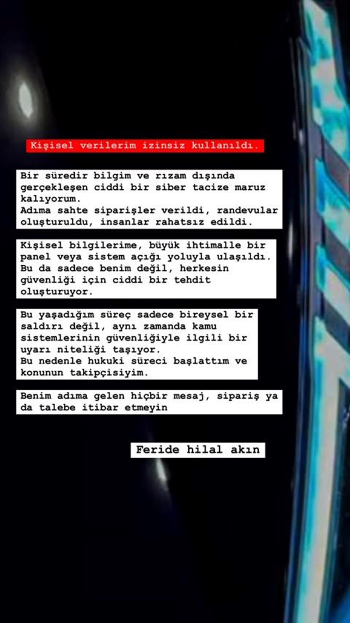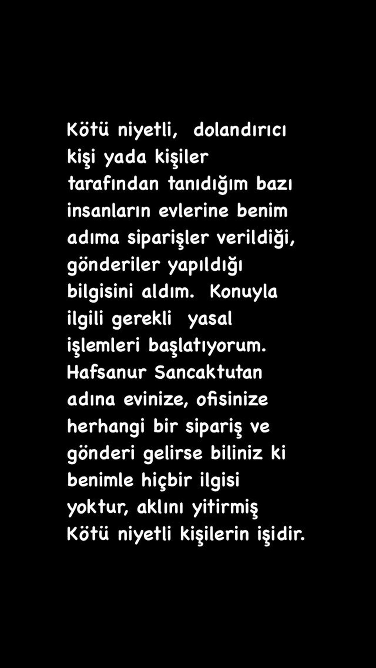 Hafsanur Sancaktutan sosyal medya hesabında yaptığı açıklamada takipçilerini dolandırıcılara karşı uyardı. Şarkıcı Feride Hilal Akın da benzer şikayetlerle hukuki süreç başlattığını açıkladı.Ünlü oyuncu Hafsanur Sancaktutan, takiçilerini dolandırıcılara karşı uyardı.Sosyal medya hesabında açıklama yapan 25 yaşındaki oyuncu şu ifadeleri kullandı:"Tanıdığım bazı kişilerin evlerine, kötü niyetli dolandırıcılar tarafından benim adıma siparişler verildiği ve gönderiler yapıldığı bilgisine ulaştım. Konuyla ilgili gerekli yasal işlemleri başlatıyorum. Hafsanur Sancaktutan adına evinize veya ofisinize herhangi bir sipariş ya da gönderi gelirse, bilin ki bunun benimle hiçbir ilgisi yoktur. Bu, aklını yitirmiş kötü niyetli kişilerin işidir.""Rampapapam", "Yok Yok" ve "Bilir mi?" gibi şarkılarla tanınan ünlü şarkıcı Feride Hilal Akın da sosyal medya hesabında dolandırıcıların hedefi olduğunu açıkladı.Adına sahte siparişler verildiğini ve kişisel bilgilerinin yasa dışı bahis sitelerinde kullanıldığını açıklayan 29 yaşındaki şarkıcı "Kişisel verilerim izinsiz kullanıldı. Bir süredir, bilgim ve iznim dışında ciddi bir siber tacize maruz kalıyorum. Adıma sahte siparişler verildi, randevular oluşturuldu, insanlar rahatsız edildi. Kişisel bilgilerime, büyük ihtimalle bir sistem açığı yoluyla ulaşıldı. Bu durum, sadece benim değil, herkesin güvenliği için ciddi bir tehdit oluşturuyor." ifadelerini kullandı.Akın sözlerini şu ifadelerle tamamladı:"Bu yaşadığım bu süreç, yalnızca bireysel bir saldırı değil, aynı zamanda kamu sistemlerinin güvenliğiyle ilgili bir uyarıdır. Hukuki süreci başlattım ve konunun takipçisiyim. Benim adıma gelen hiçbir mesaj, sipariş veya talebe itibar etmeyin."Geçtiğimiz haftalarda Cemre Baysel, Buçe Kahraman ve Bengü gibi ünlü isimlerin de benzer şikayetlerde bulunduğu ortaya çıkmıştı. Kendisine "hayran" izlenimi veren kişinin, çok sayıda ünlü ismin kişisel bilgilerini kullandığı, evlerine yemek sipariş ettiği öğrenildi. HABERİN DETAYLARI İÇİN TIKLAYIN