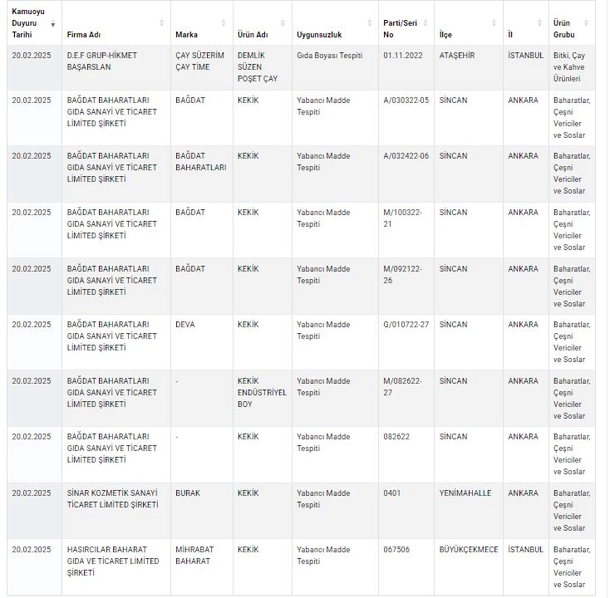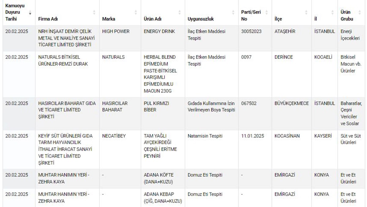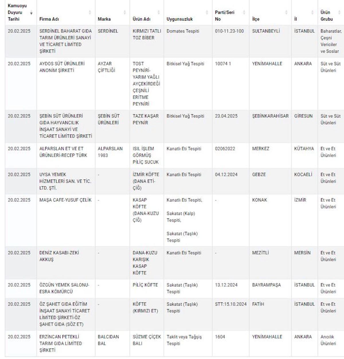 Tarım ve Orman Bakanlığı, sağlığı tehlikeye düşürecek ve taklit-tağşiş gıdalar listesini yeniledi. Yapılan denetimlerde Konya'da faaliyet gösteren bir firmanın adana kebap ve köftesinde domuz eti tespit edildi. İşte Bakanlığın listesinde yer alan sahte ürün ve üreticiler......Tarım ve Orman Bakanlığı, taklit-tağşiş yapılan ve sağlığı tehlikeye düşürebilecek gıdalar listesini güncelledi.Söz konusu liste bakanlığın internet sitesinde kamuoyuyla paylaşıldı.Yapılan denetimlerde kişilerin hayatını ve sağlığını tehlikeye düşürecek şekilde bozulmuş ve değiştirilmiş ürün sayısı 6 artarak 201'e çıktı.Konya'nın Emirgazi ilçesinde faaliyet gösteren "Muhtar Hanımın Yeri"nde yapılan denetimlerde Adana kebap ve köftede domuz eti tespit edildi. Yapılan diğer denetimlerde de bitkisel macun ve enerji içeceğinde de ilaç etken madde tespit edildi.Taklit veya tağşiş yapıldığı kesinleşmiş ürünlere ait liste de güncellendi. Ürünlere aynı değeri taşımayan başka bir maddenin, o madde yerine aynı maddeymiş gibi katılan ürün sayısı 21 artarak 977'ye yükseldi.Yapılan denetimlerde baharatlarda yabancı madde, Çayda gıda boyası, sucukta kanatlı eti ve köfte sakatat tespit edildi.Ürünlere temel özelliğini veren öğelerin ve besin değerlerinin tamamının veya bir bölümünün mevzuata aykırı olarak çıkarılan ürünlerde 18 artarak 81'e yükseldi.