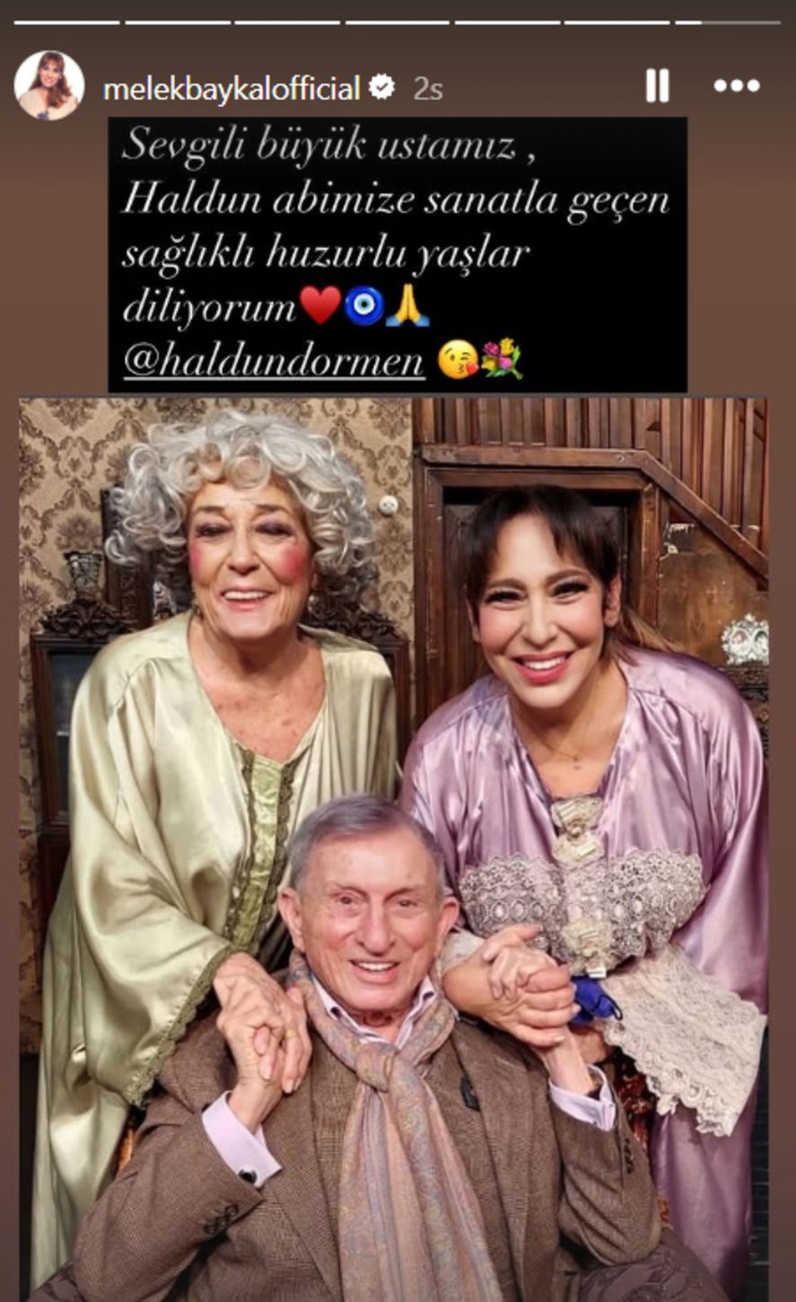 Ünlü oyuncu, paylaşımına "Sevgili büyük ustamız Haldun abimize, sanatla geçen sağlıklı ve huzurlu yıllar diliyorum" notunu düştü.